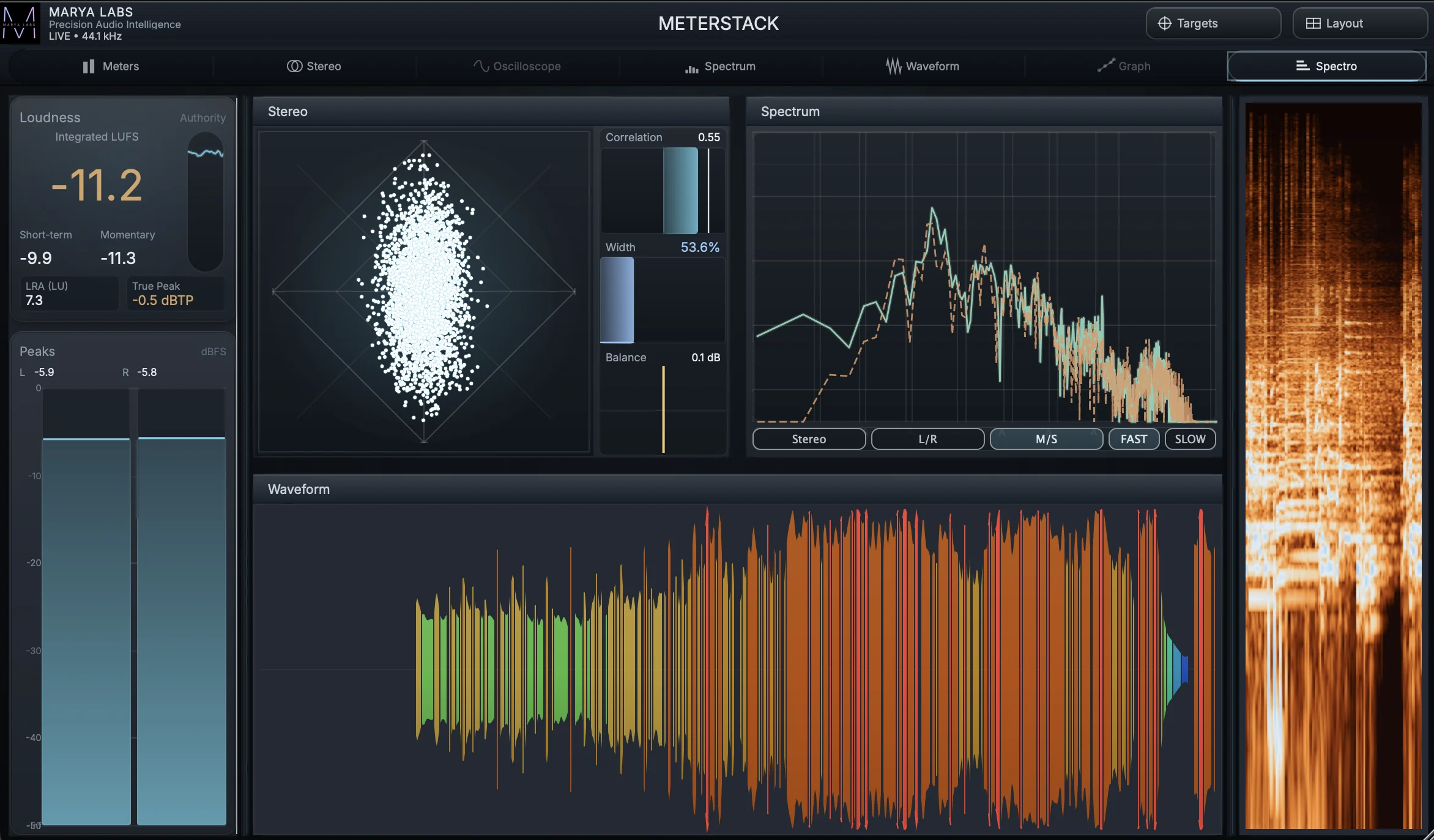 A modern audio metering suite designed for producers and mix engineers who need industry-standard loudness compliance combined with detailed stereo analysis.